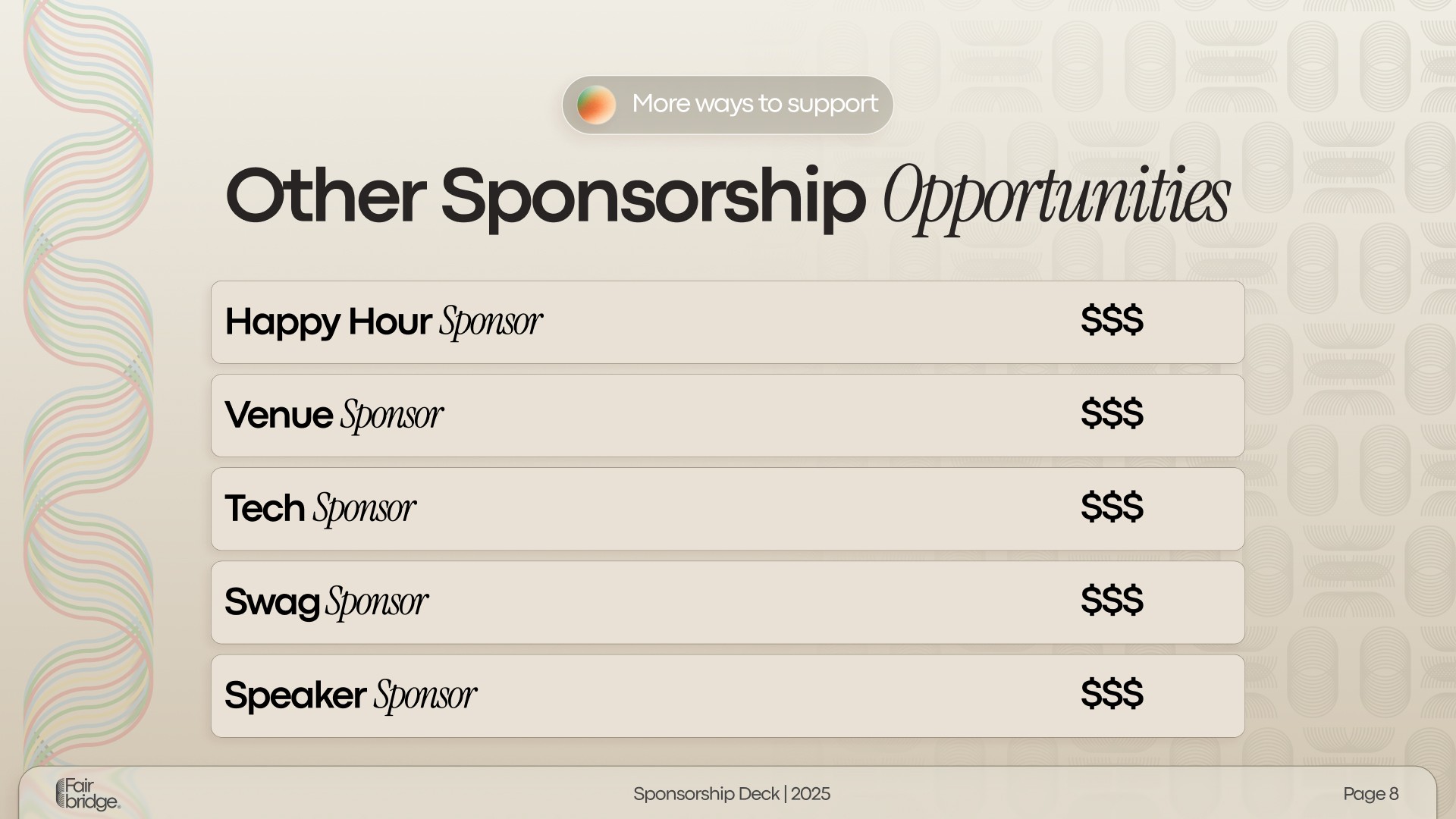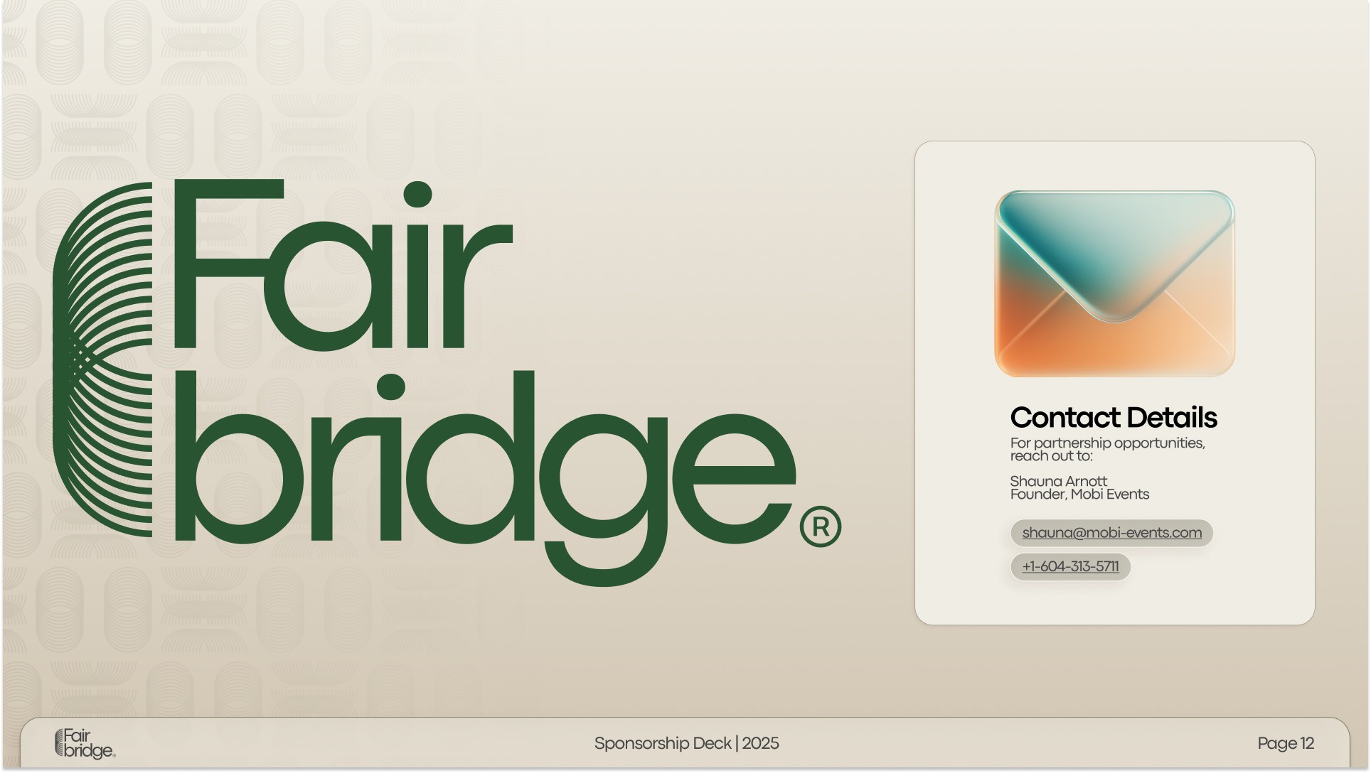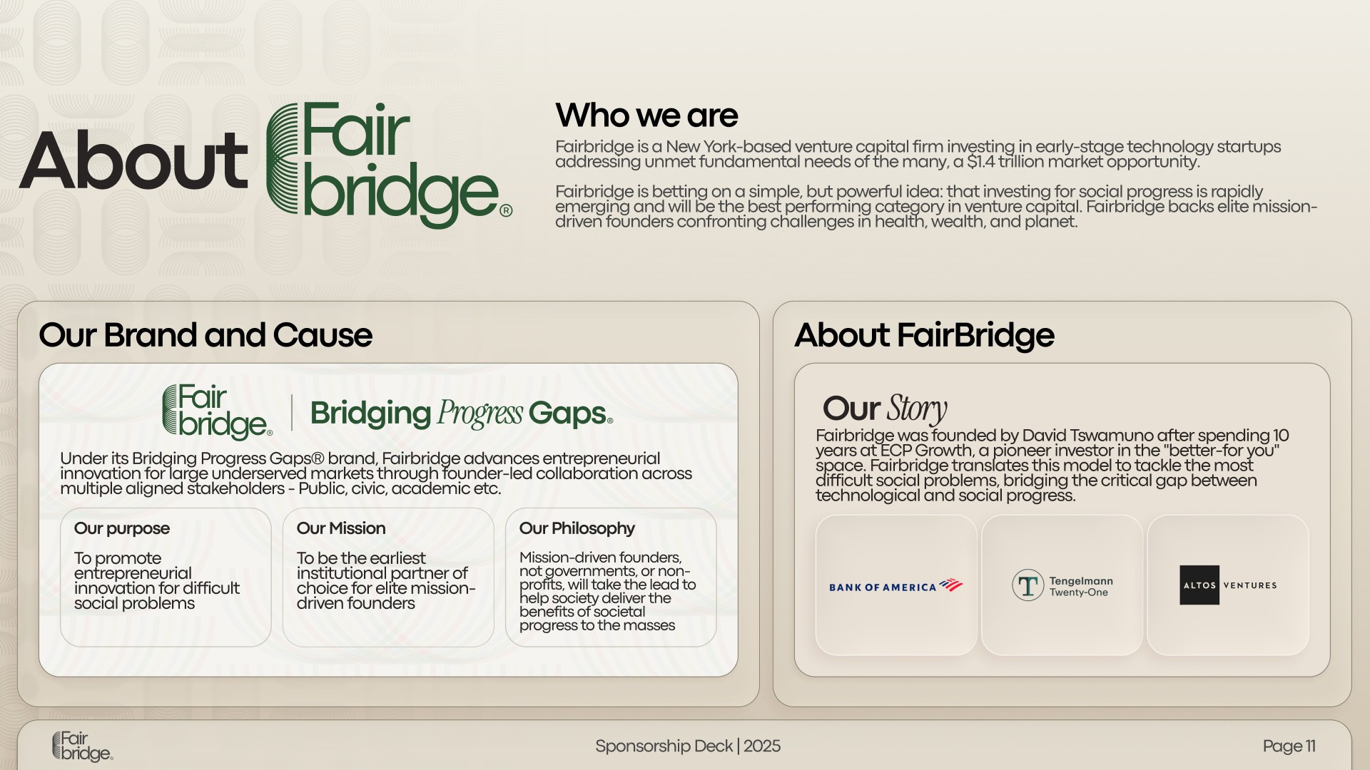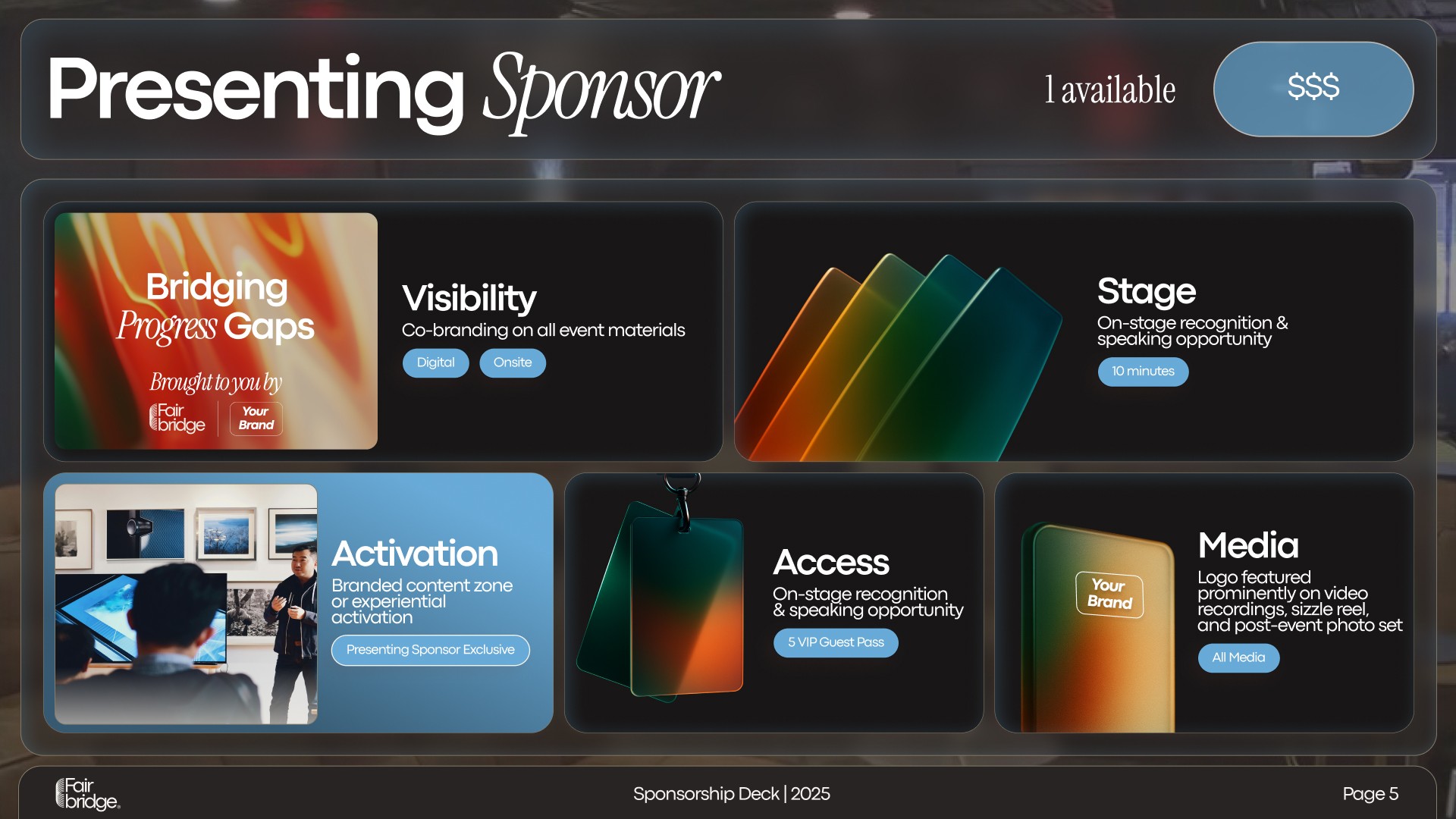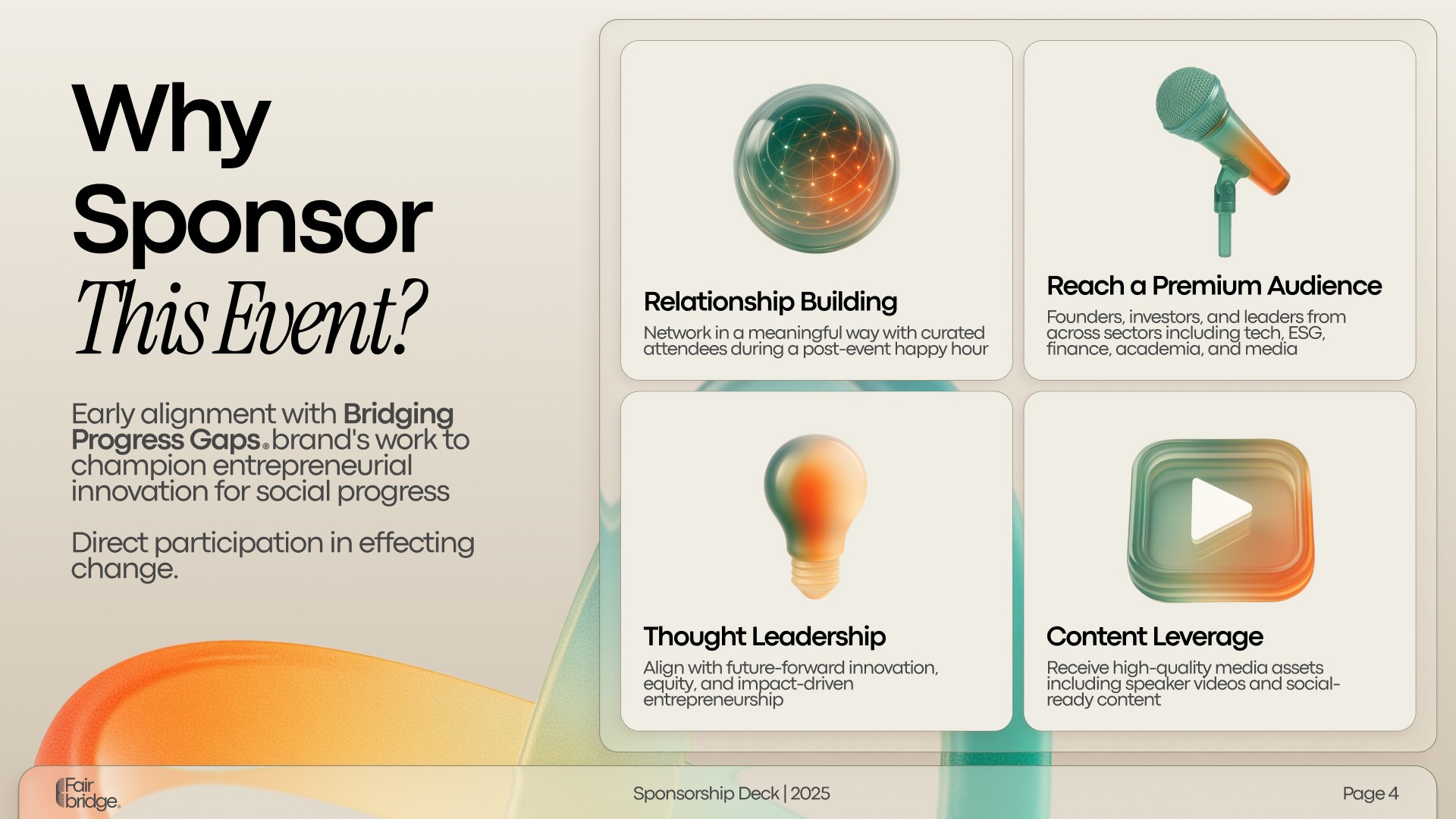 Fairbridge needed to convince sponsors and guest speakers to back a brand new conference. The pitch deck had to do that work before anyone had heard of Progress Summit.